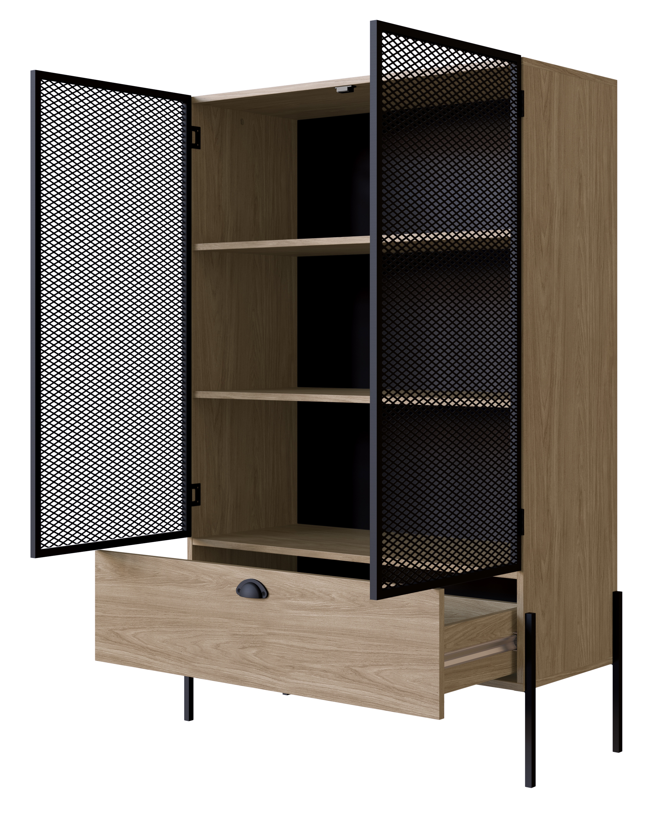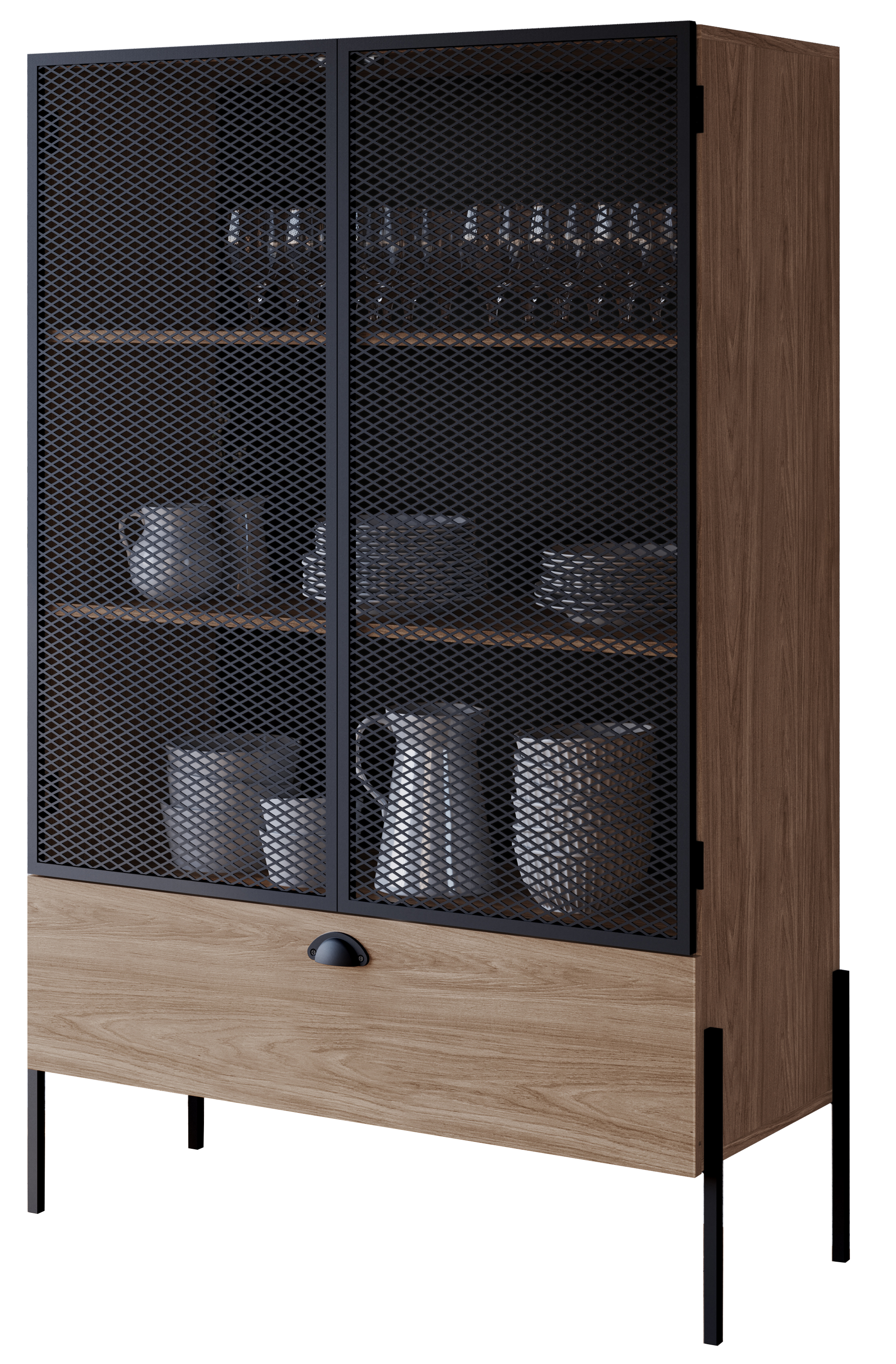 Cristalero MDF melamínico. Estantes internos con puertas de metal perforado. Cajón bajo con tirador metálico.