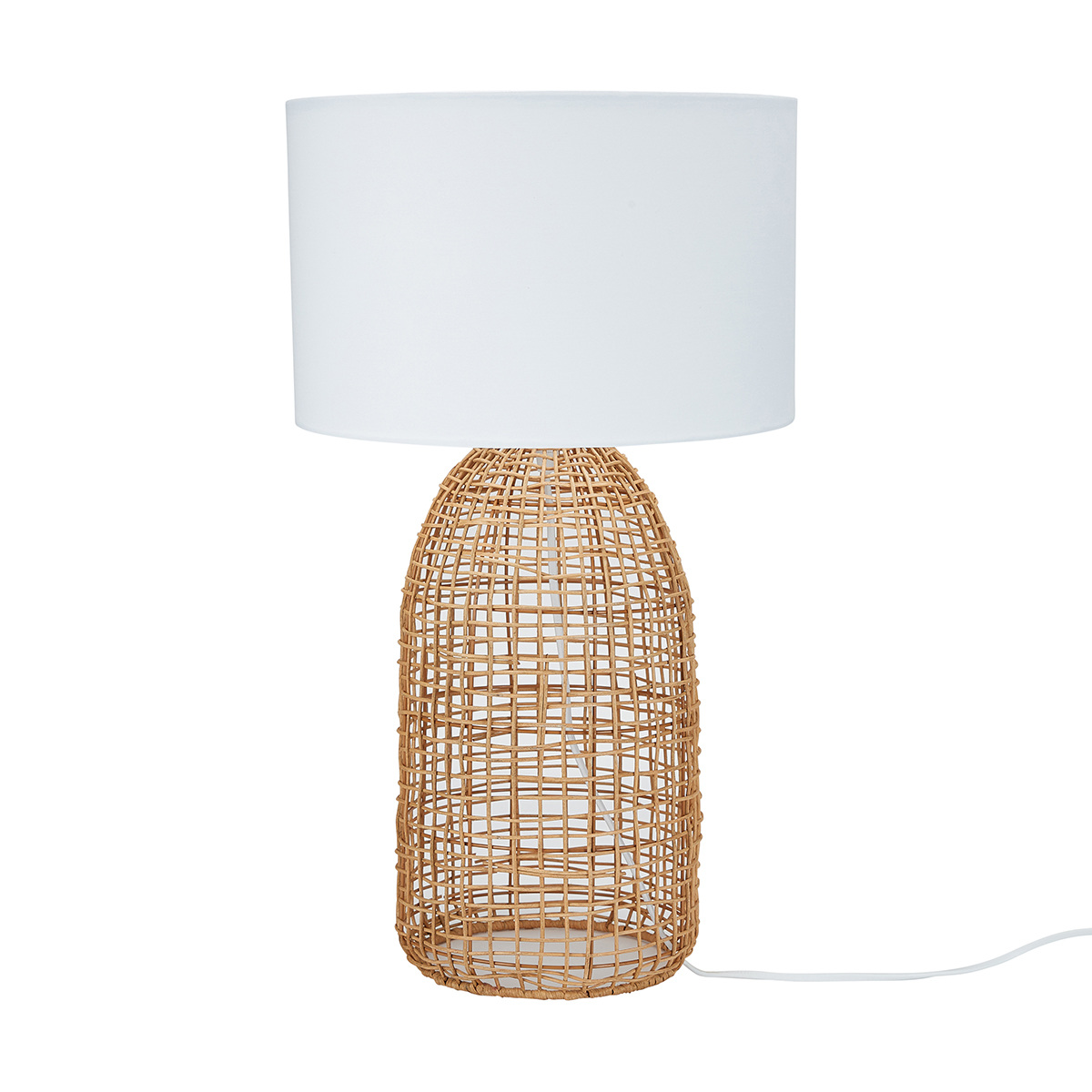 Lampara de mesa base de bambú y pantalla en color blanco.
