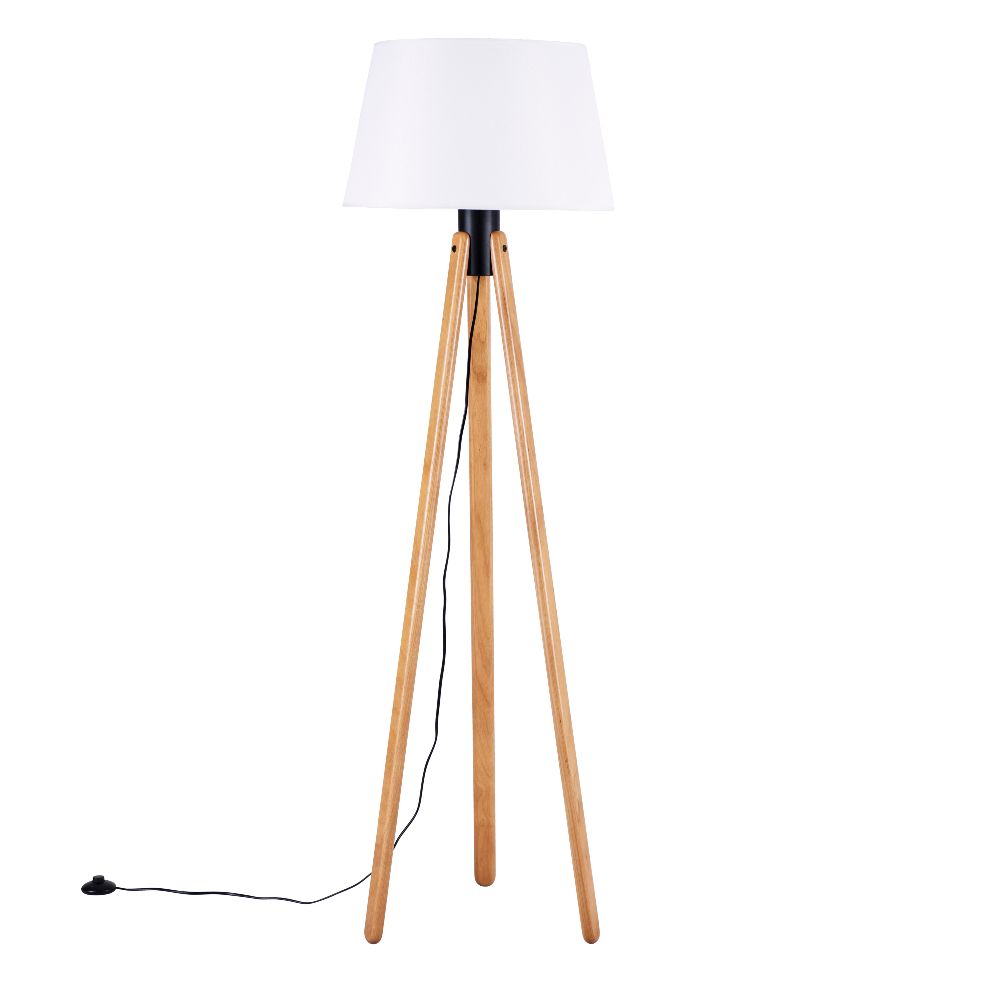 Lampara de pie en madera Imbuía con pantalla en tela blanca.