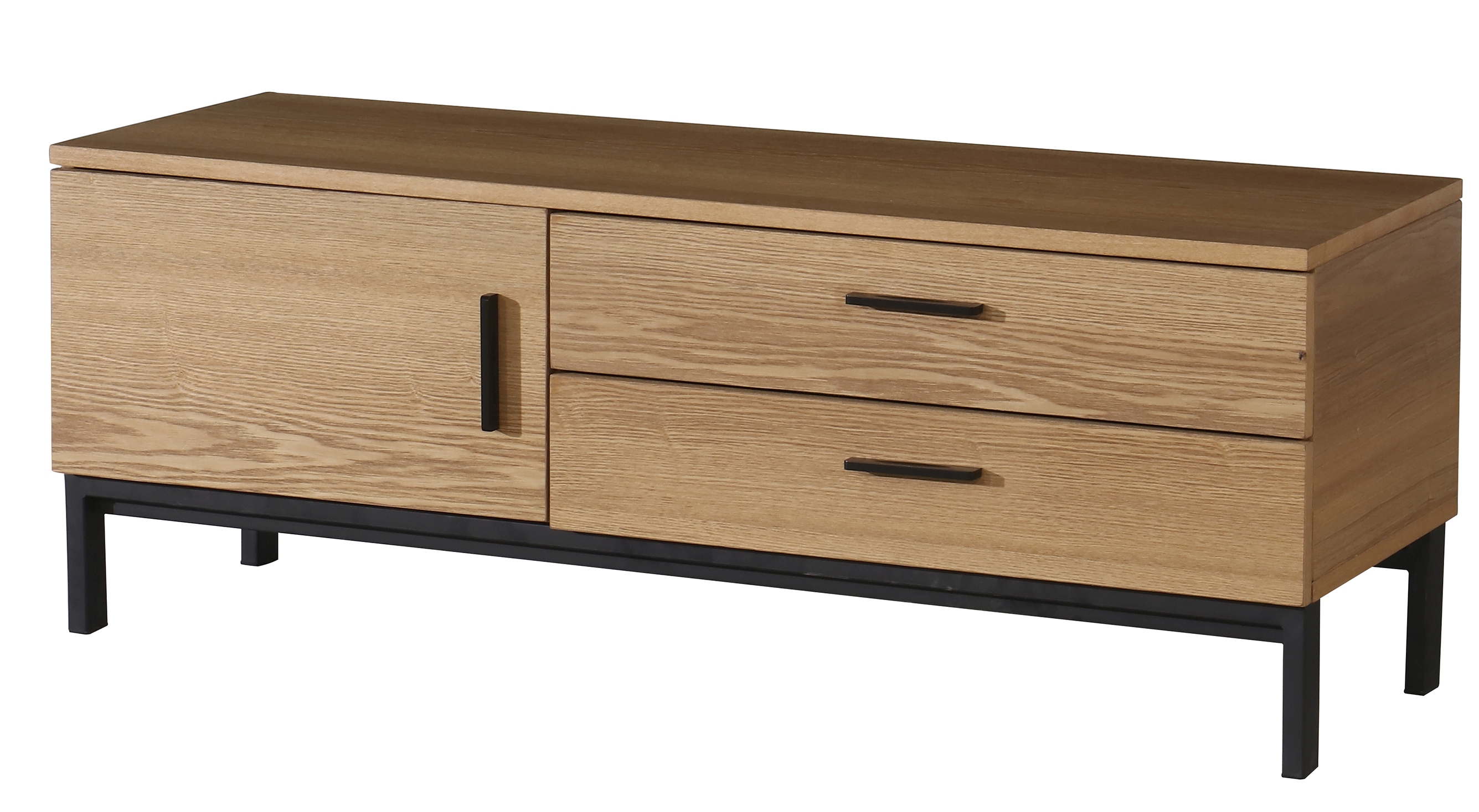 Rack de diseño Industrial, combina madera con hierro color negro. Puerta con sistema de bisagras auto reten y cajones.