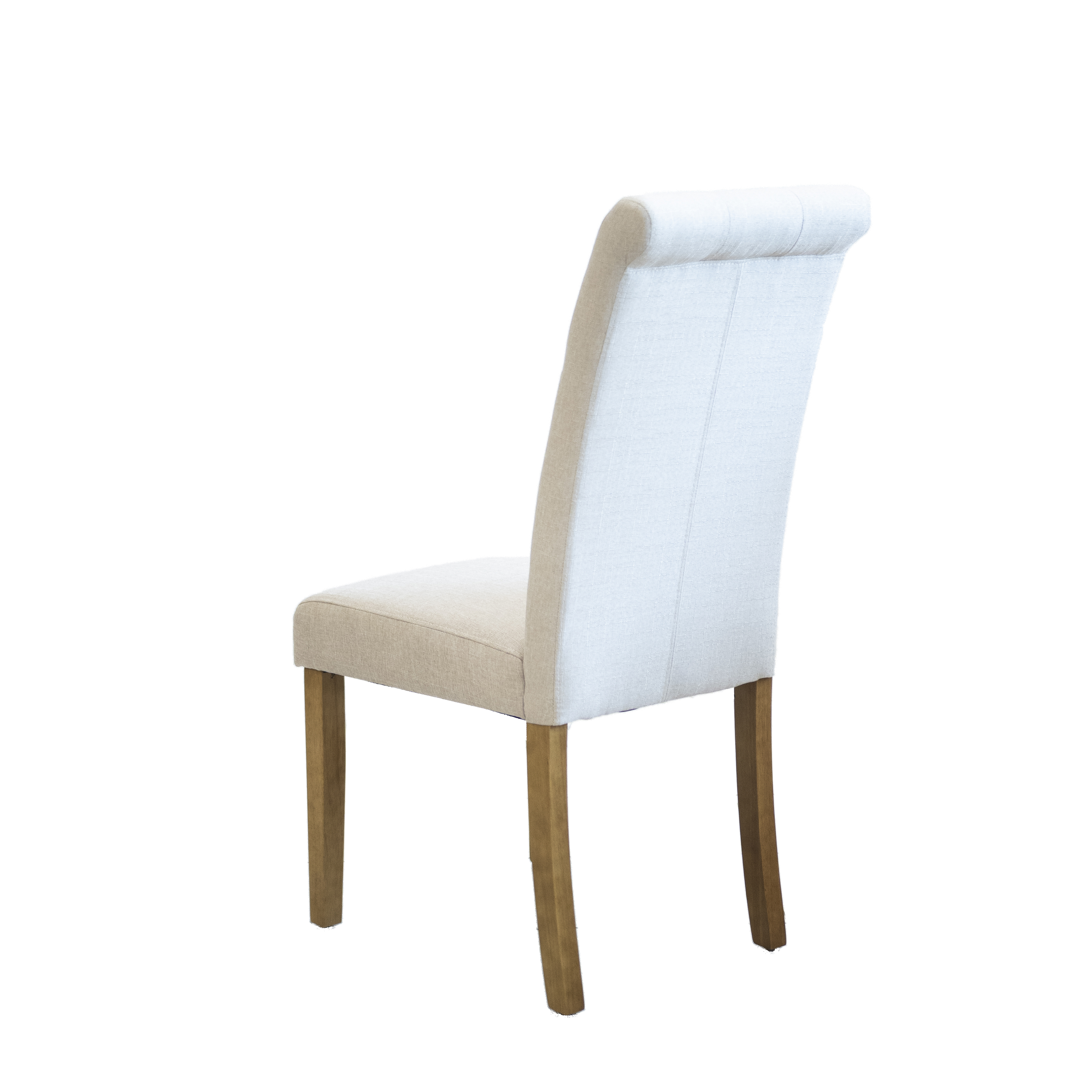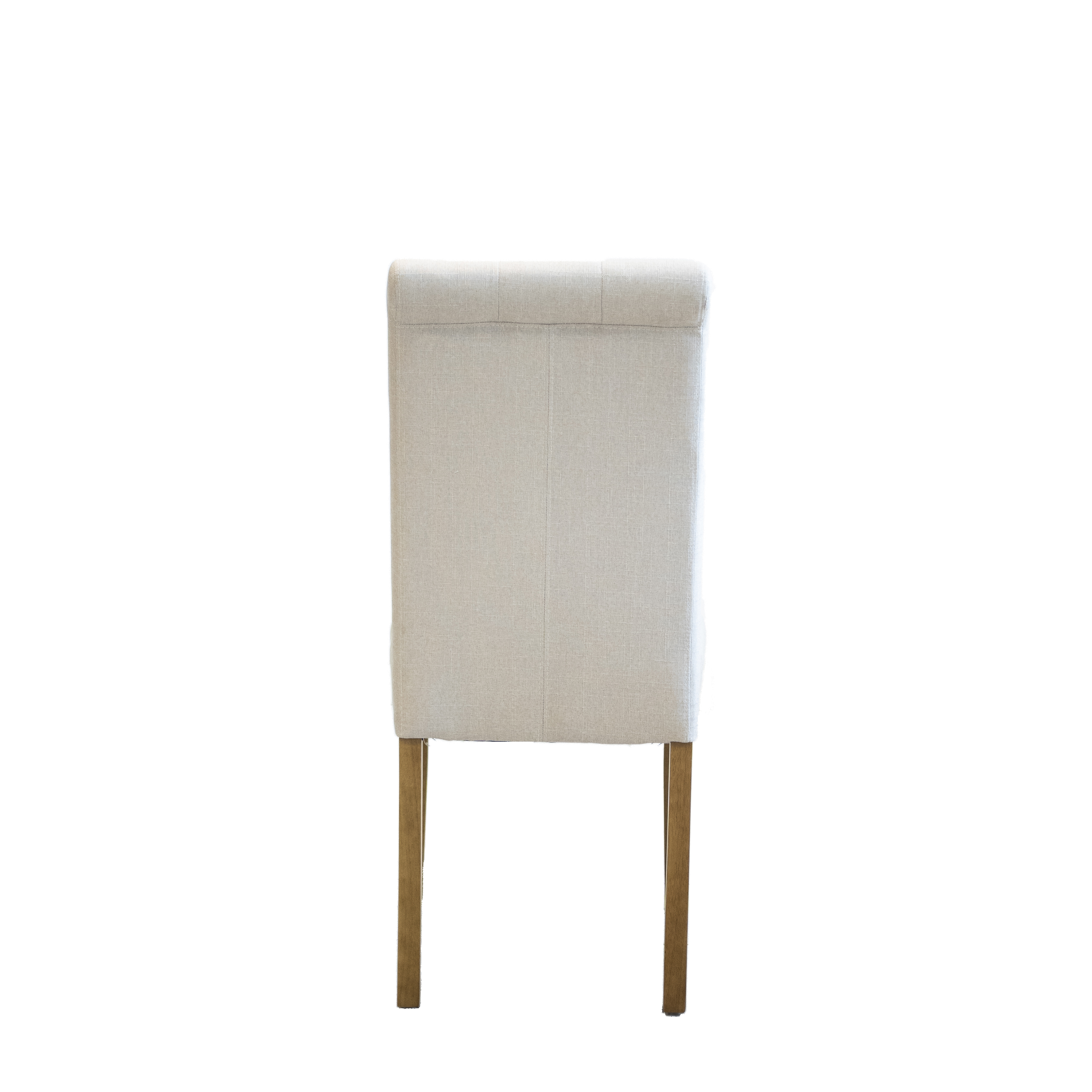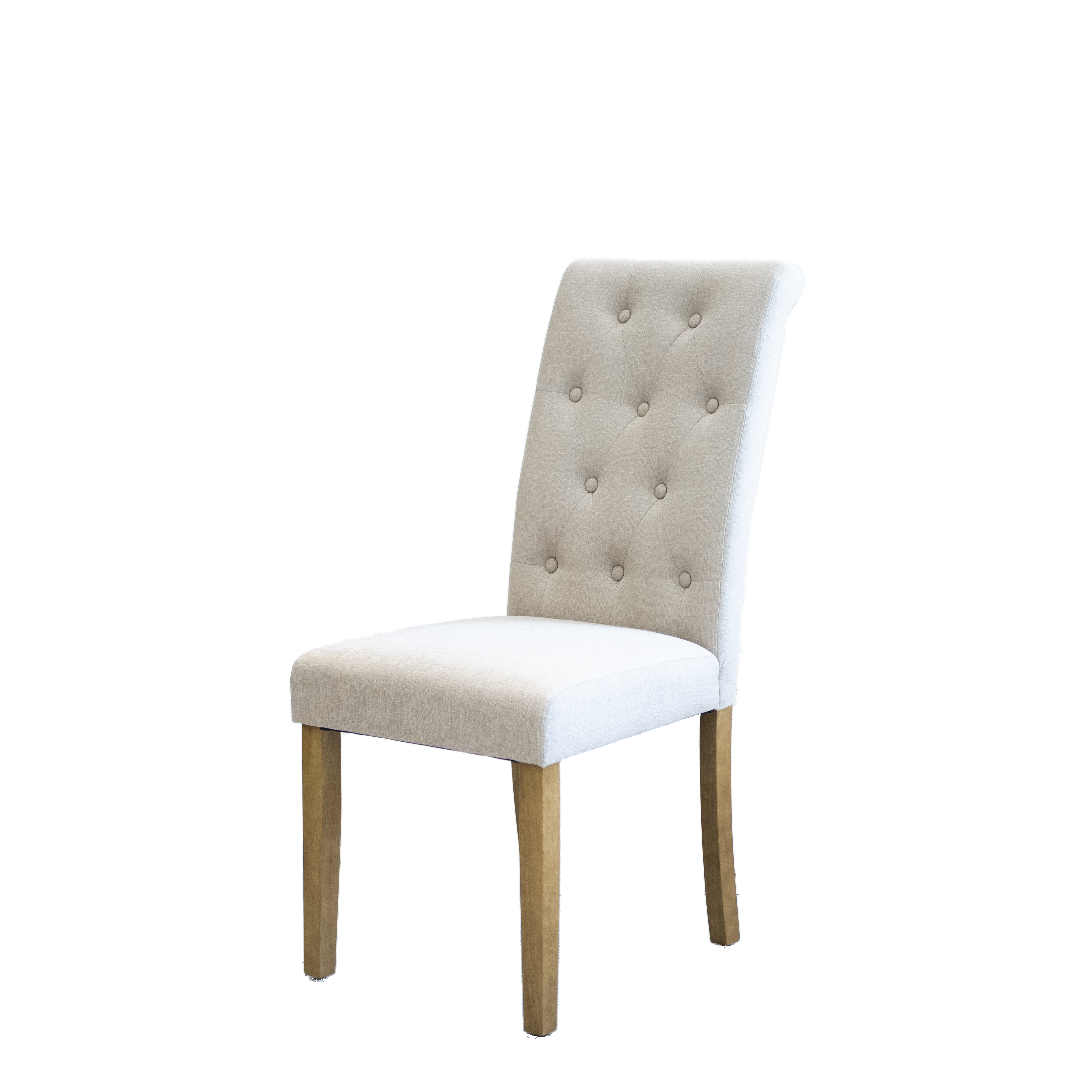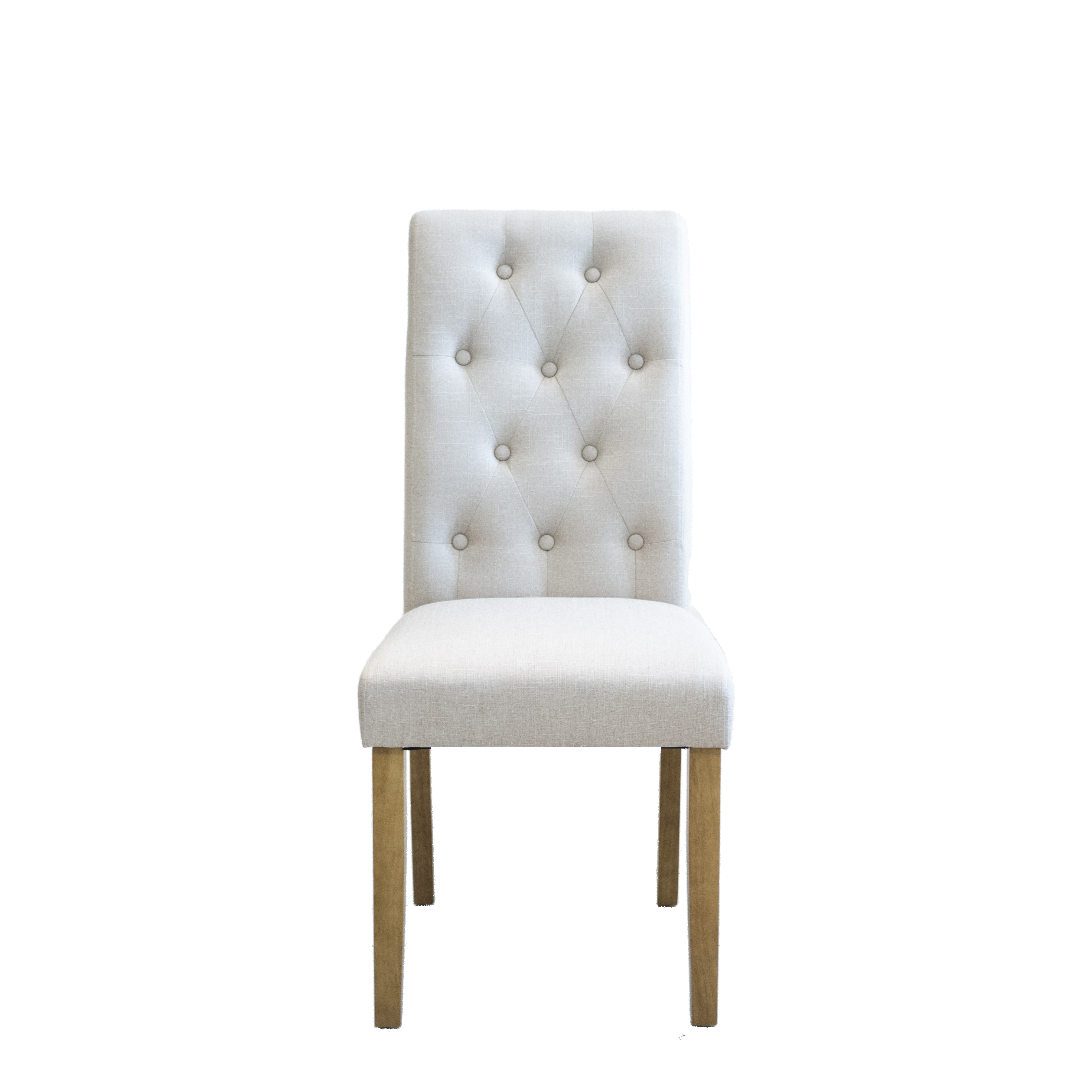 Silla de estilo clásico con respaldo capitoneado, elegante y confortable. Patas color natural.