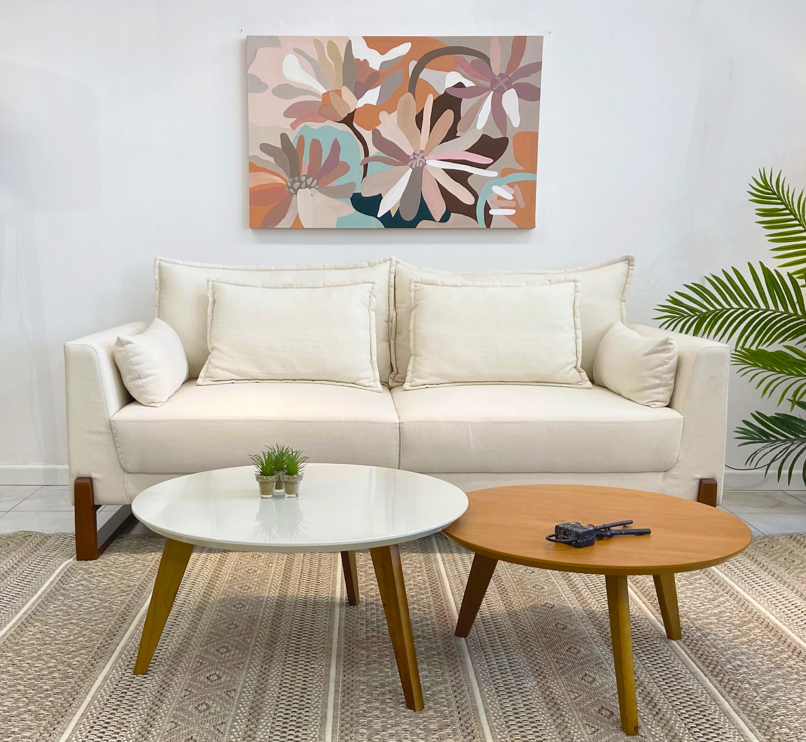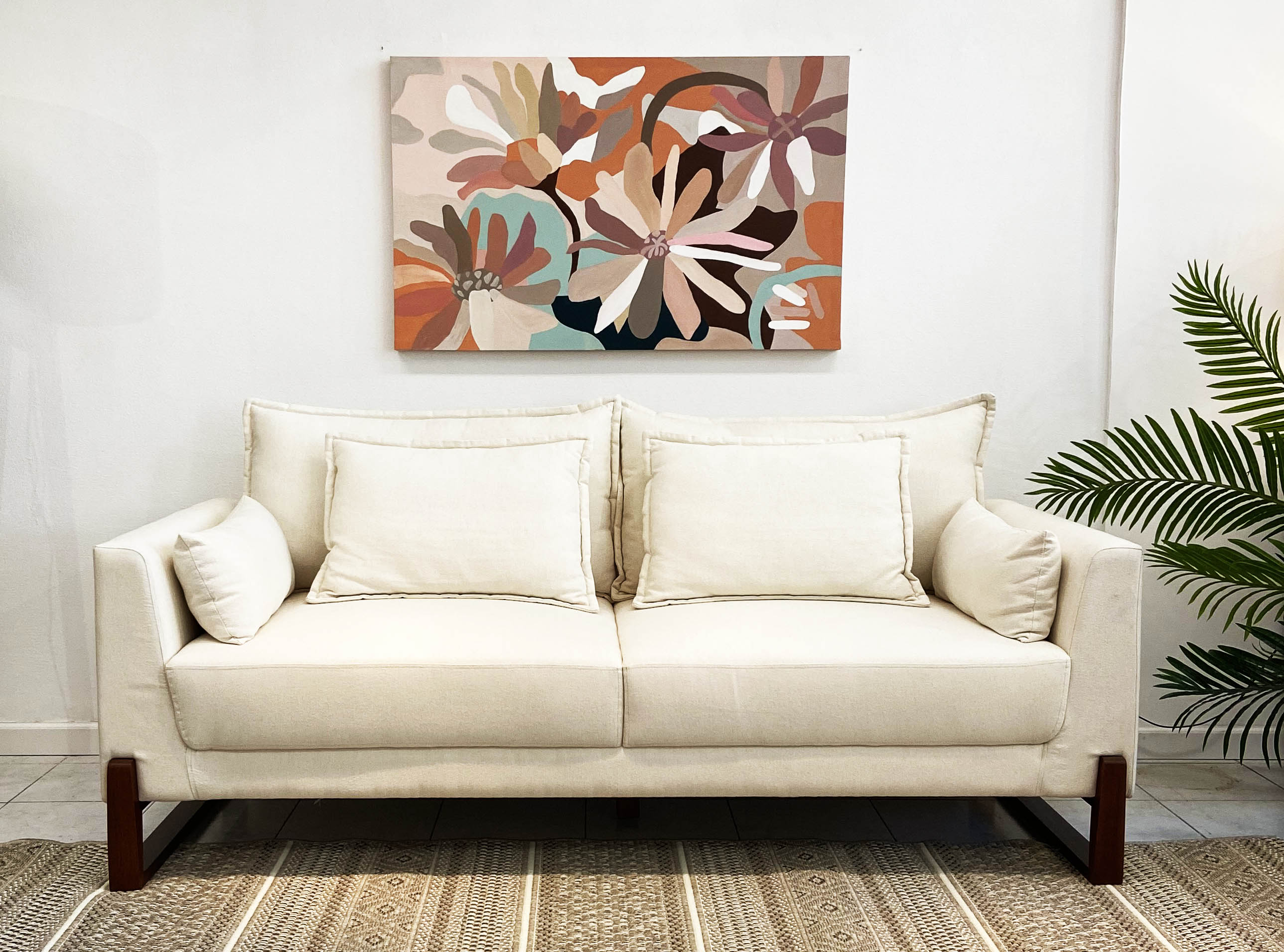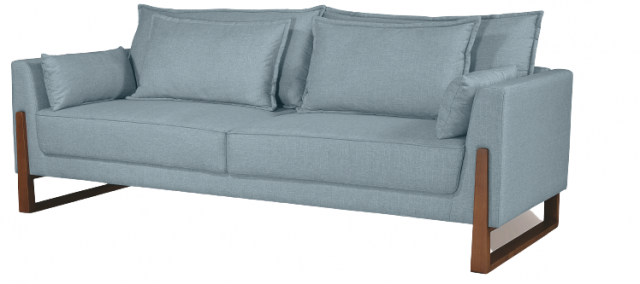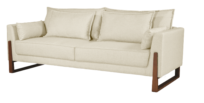 Sofá de línea moderna, sencilla y descontracturada. Detalle de patas en madera maciza.