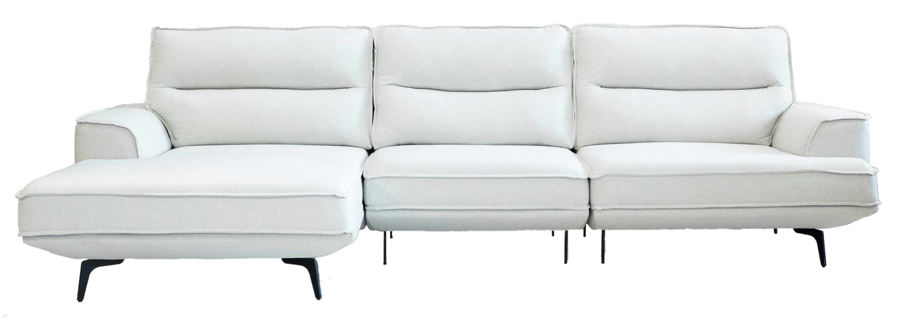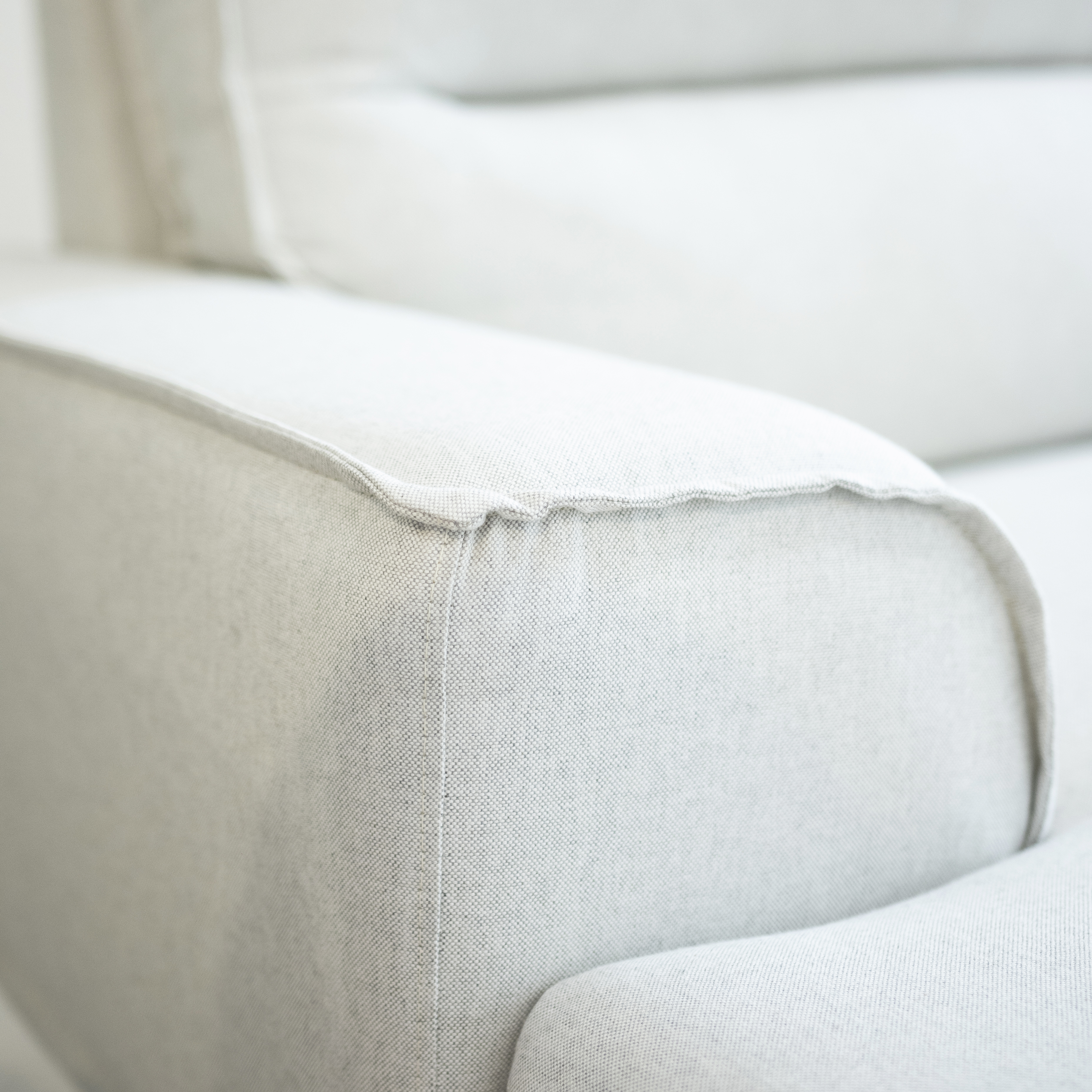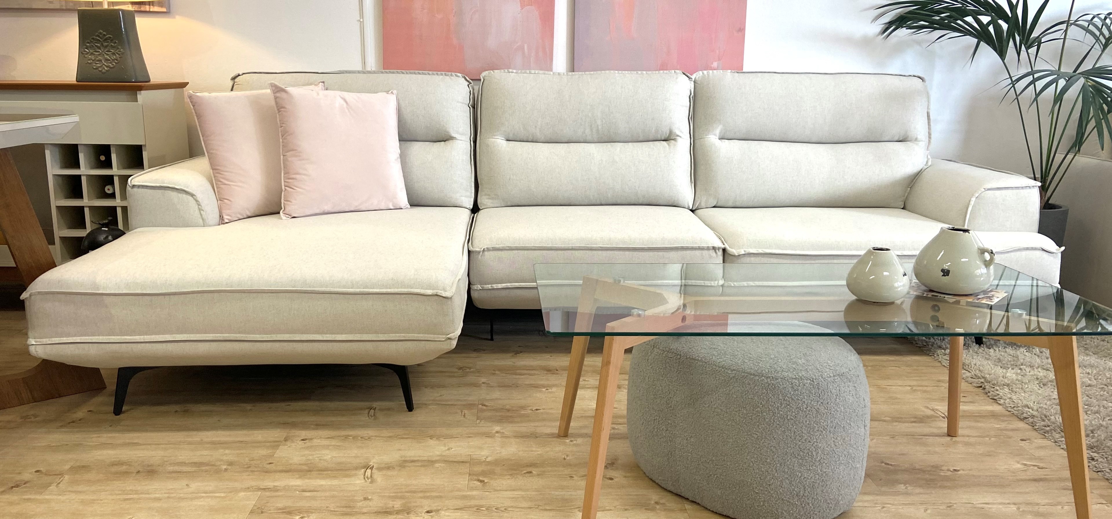 Sofá de moderno y cómodo diseño. Base de hierro negro y tapizado en tela rústica WATERPROOF.