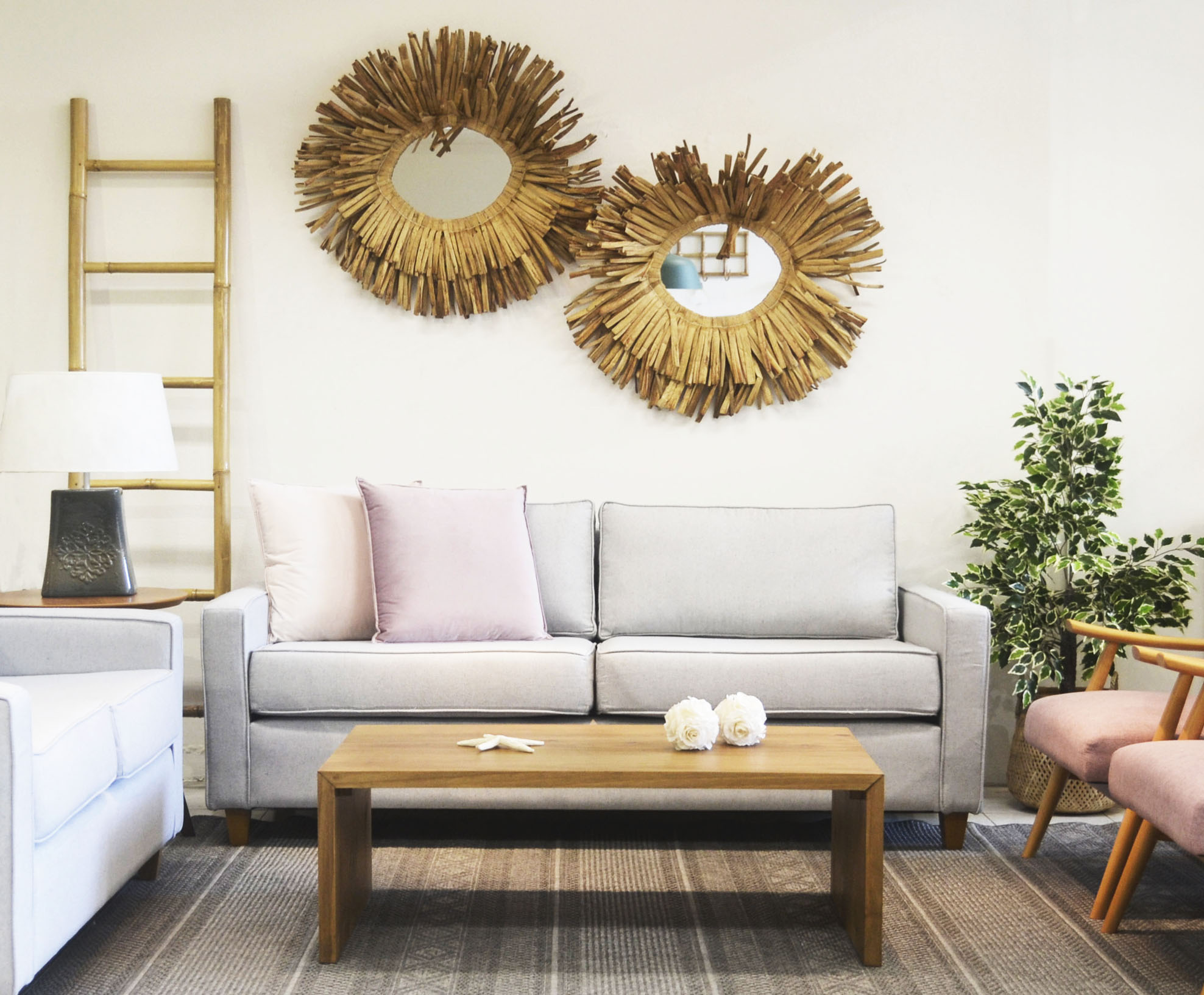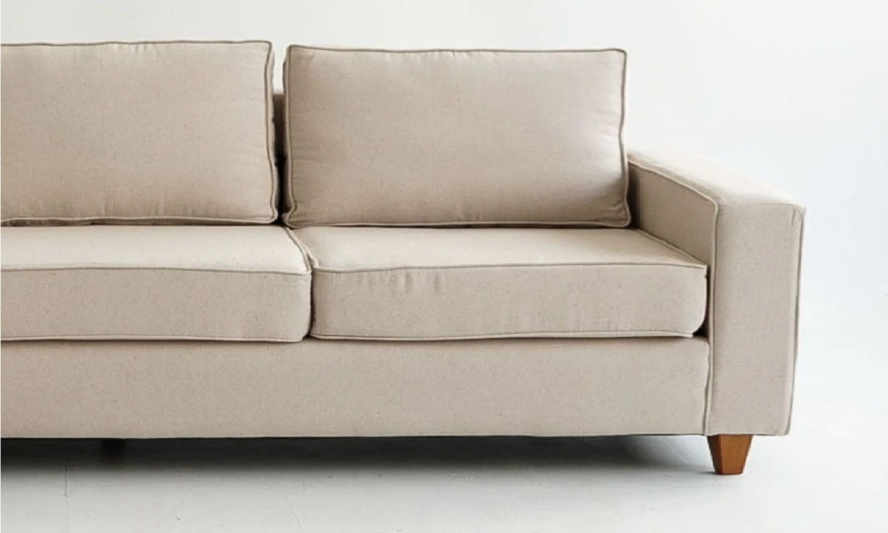 Sofá de líneas rectas con almohadones independientes. Tapizado en tela rústica.